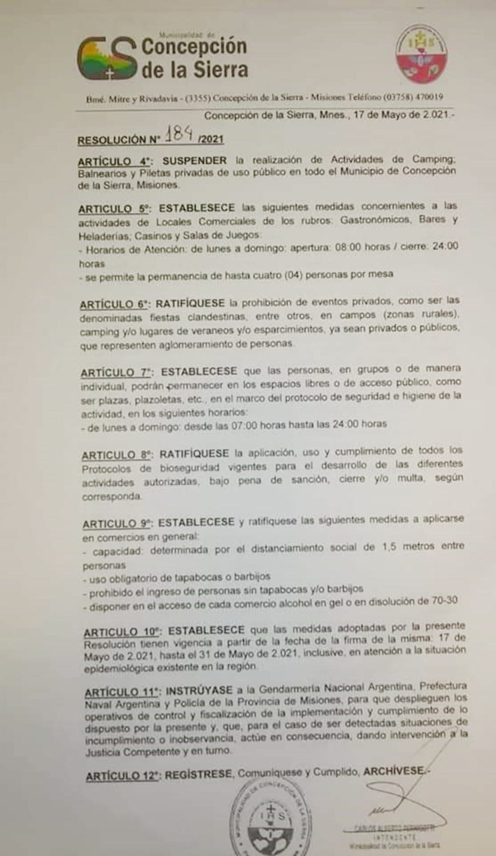 La Municipalidad de Concepción de la Sierra, a través de la Resolución Nº 184/2021, estableció ayer nuevas restricciones en la localidad atendiendo la actual situación epidemiológica.