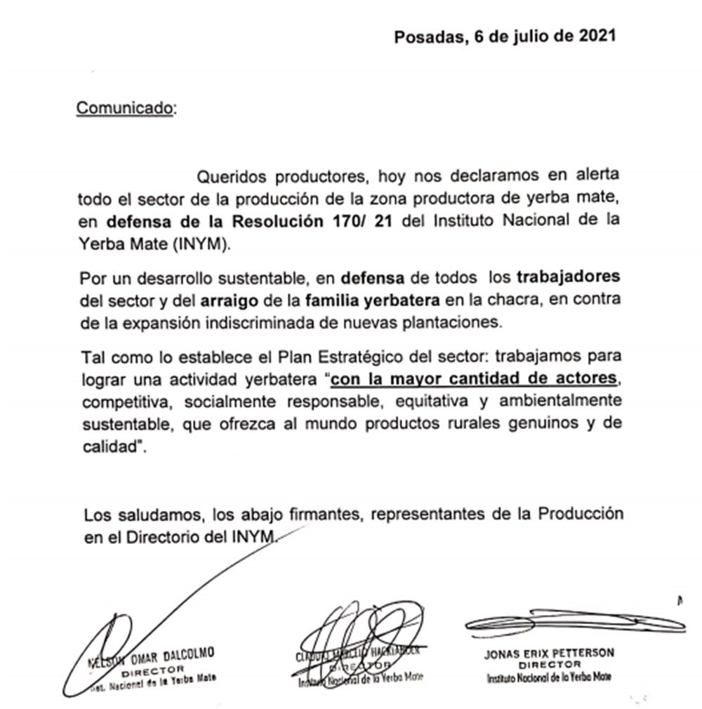 Este martes, los representantes de la Producción por Misiones en el Directorio del Instituto Nacional de la Yerba Mate (INYM) emitieron un comunicado en el cual informaron que están en alerta “en defensa de la Resolución 170/21 del Instituto Nacional de la Yerba Mate. Por un desarrollo sustentable, en defensa de todos los trabajadores del sector y del arraigo de la familia yerbatera en la chacra, en contra de la expansión indiscriminada de nuevas plantaciones”.