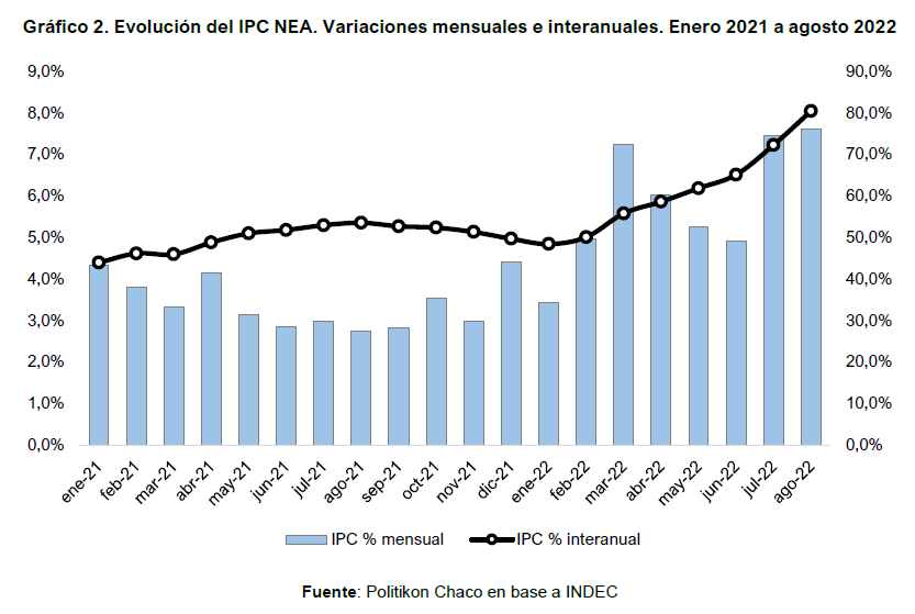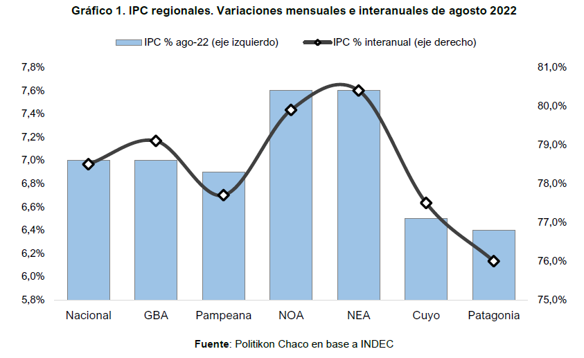 El Índice de Precios al Consumidor (IPC) correspondiente a la región del NEA registró una suba del 7,6% en agosto, un 0,2% superior a la del mes previo y la máxima desde que se empezó a medir la inflación regional en diciembre de 2016, según un informe publicado este miércoles por la consultora Politikon Chaco en base a los números oficiales del INDEC.