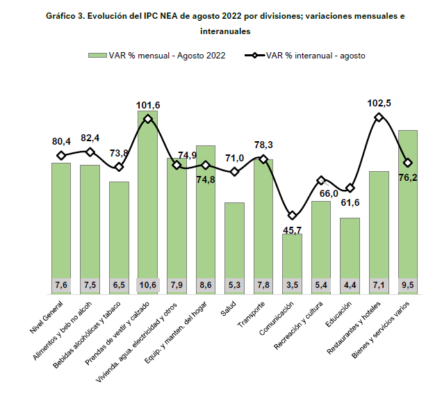 Por su parte, el acumulado del año exhibe en la región un alza del 57,6%, el mayor a nivel histórico para el período enero-agosto, y segundo más alto del país; y finalmente, en la comparación interanual, la inflación en el NEA ya llegó al 80,4%, siendo no solo la más alta del país, sino también récord histórico para la región.