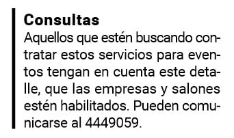 También explicó que aquellos que estén buscando contratar estos servicios para eventos tengan en cuenta este detalle, que las empresas y salones estén habilitados. Borsini proporcionó un número telefónico “donde pueden comunicarse para expresar sus dudas y quejas, es el 4449059, nosotros intentaremos dar respuesta lo antes posible”, cerró.