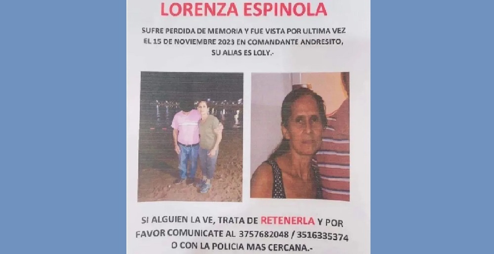 El pasado 15 de noviembre, Lorenza Espíndola, de 63 años, salió de su casa en la localidad de Andresito, con rumbo desconocido, y hasta hoy se desconoce su paradero.