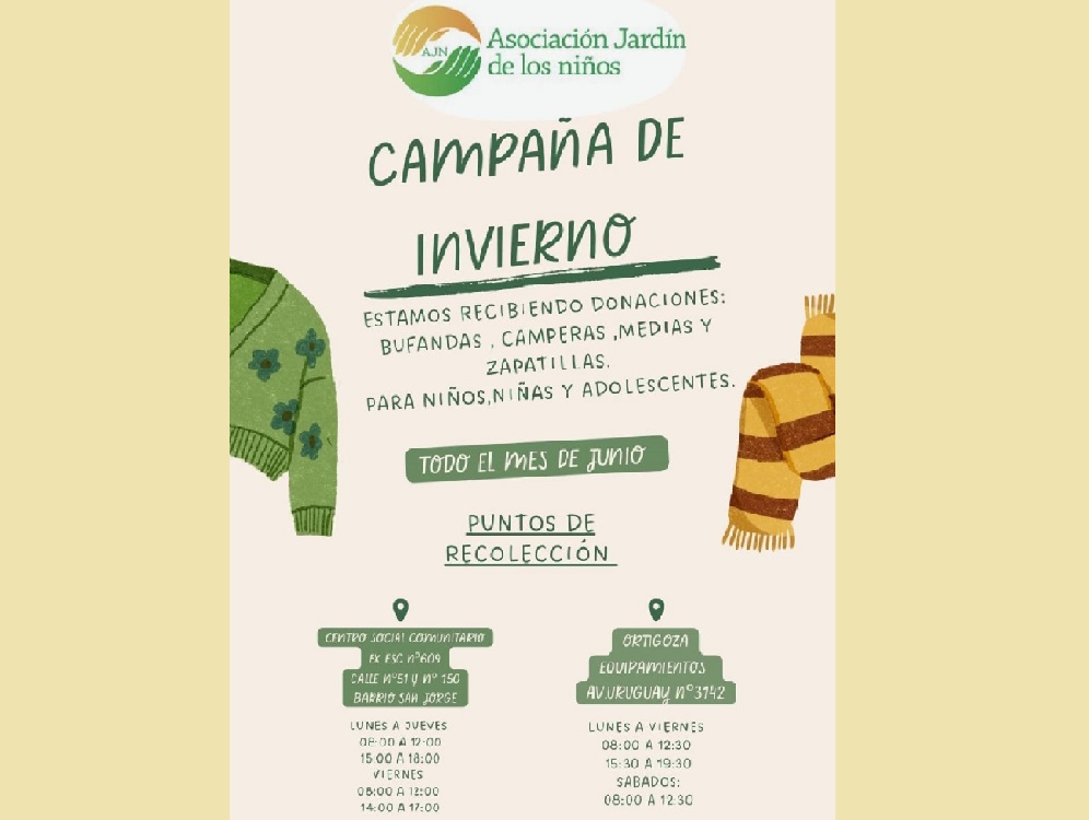 La Asociación Jardín de los Niños, de Posadas, lleva adelante una “Campaña de Invierno”, a los fines de recolectar donaciones de abrigos, bufandas, camperas, medias y zapatillas para niños, niñas y adolescentes, de cara a esta época invernal que se avecina.