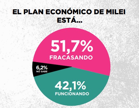 Algunos datos asoman como relevantes: un 51% cree que la gestión económica está fracasando, un 70% dice que su economía personal empeoró desde que Milei es presidente, y un 55% cree que Milei no es capaz de controlar el precio del dolar.