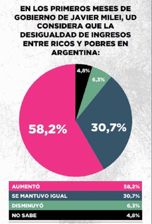 Además, agregó: “El 70 por ciento de los argentinos considera que su economía y su situación personal empeoró desde que Milei es presidente, y solo un 22 por ciento de los argentinos cree que los sueldo le están ganado a la inflación”.