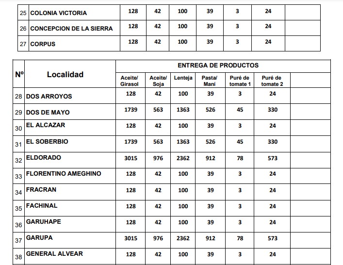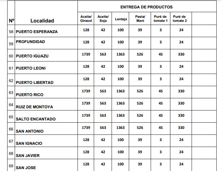 Sin embargo, “nosotros le hicimos una propuesta equitativa al Ministerio de Desarrollo Humano, para repartir dichos alimentos dentro de los 78 municipios misioneros y ellos estuvieron de acuerdo, tomando como punto de referencia indicadores propios, nuestros del Ministerio de Desarrollo Social de Misiones”.