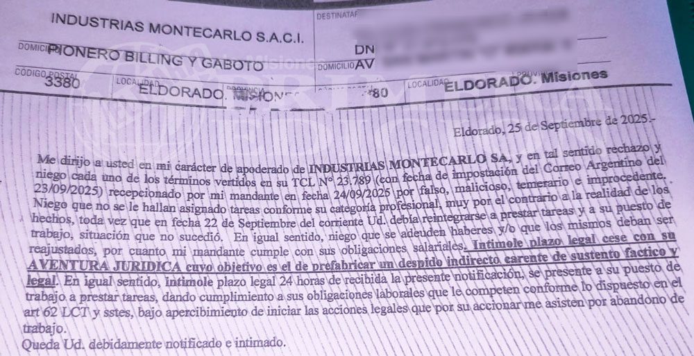 En diálogo con FM 89.3 Santa María de las Misiones el delegado de los trabajadores, Denis Guayuan, denunció que “recibimos un telegrama del apoderado de la planta, donde nos intima a que volvamos a trabajar dentro de las 24 horas o estábamos en abandono de trabajo”. Aseguró que terminado el periodo de suspensión, se presentaron pero “la planta estaba cerrada y no nos dejaron trabajar”.